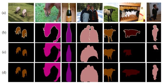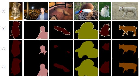 Comparison of segmentation results on PASCAL VOC 2012 verification set. (a) Original images. (b) Ground truth labels. (c) Segmentation labels produced by the SEAM model. (d) Segmentation labels produced by the DAEN model.