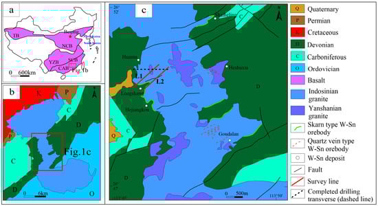 Comprehensive geological map of the Xitian mining district: (a) geological sketch map of China with different geological blocks and neighboring countries (modified from [49]), (b) schematic geological map of the Xitian W–Sn ore deposits (modified from [50]), and (c) detailed schematic geological map of the Xitian W-Sn ore deposit field (modified from [49]). TB: Tarim block, CAB: Cathaysian block, NCB: North China block, SCB: South China block, YZB: Yangtze block.