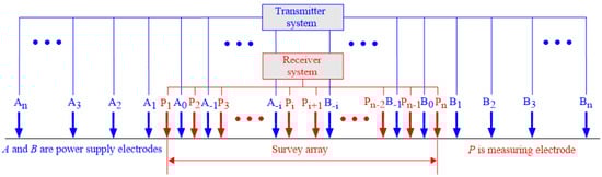 During field operations, the measurement electrode array of the multi-channel receiving system is first deployed along the survey line. The current electrode pair AB is progressively expanded outward from the center of the measurement array, with all adjacent electrode pairs simultaneously receiving signals during each current injection. As the AB pair moves from the inner to outer sections of the array, the electrode spacing increases arithmetically within the measurement array to acquire shallow geoelectric information, while outside the measurement array, the current electrode spacing increases by multiples of the measurement electrode interval. For longer survey profiles, multiple measurement arrays need to be deployed sequentially to complete the survey.