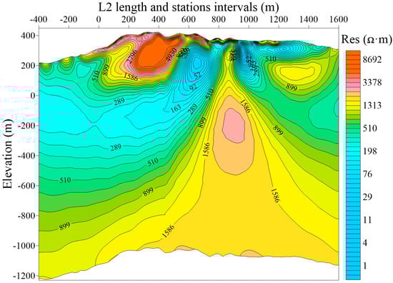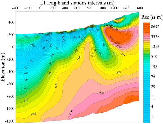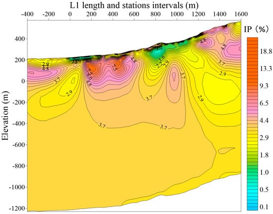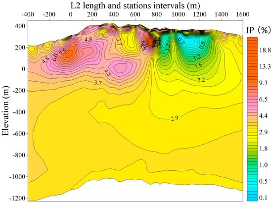 Figure 4 and Figure 5 present the resistivity/chargeability inversion results for line L1. The inversion reveals transitional zones between stations 520–620 and 920–1000, likely caused by fracture zones. The resistivity inversion shows minimal near-surface variations, with a 50–150 m thick low-resistivity layer interpreted as clay-rich weathering products. A dike-like high-resistivity anomaly occurs between stations 700 and 850, possibly representing intrusive granitic porphyry or quartz porphyry. Two high-chargeability anomalous zones are identified at stations 80–440 and 950–1100, with shifting anomaly centers flanking the high-resistivity dike and corresponding to low-resistivity zones in the resistivity section. Based on spectral IP characteristics of metallic deposits, the IP anomalies at stations 400 and 1000 most likely originate from massive metallic mineralization, exhibiting typical metallic deposit signatures and potentially representing skarn-type or quartz-vein polymetallic deposits.