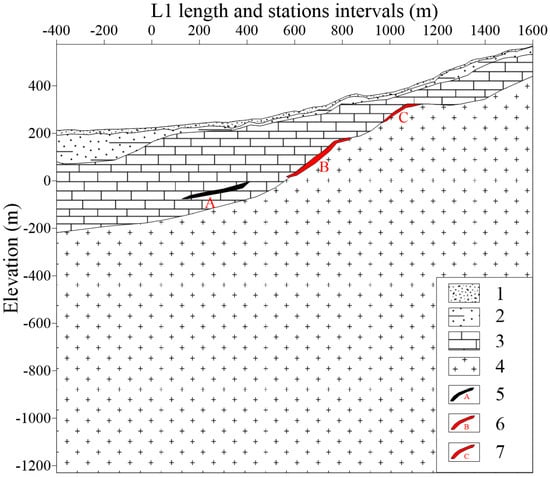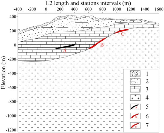 The burial depth of the igneous rock top interface gradually becomes shallower from the small mileage to the large mileage direction, with the shallowest granite top interface occurring at about 200 m depth in the section from 1400 m to 1600 m of L1. Based on the resistivity and chargeability anomaly characteristics, the low-resistivity anomaly zones that developed within high-resistivity areas or near high-resistivity anomalies are interpreted as ore veins. So, three ore veins are identified in the L1 geological profile (Figure 6): The skarn-type (Vein A) is located at the contact between volcanic rocks and sedimentary rocks in the section from 200 m to 400 m of L1, showing low-resistivity and high-polarization features with its top interface around 0 m elevation. The greisen-type (Veins A and B) occurs at the contact zone between igneous rocks and sedimentary rocks: Vein B in the section from 500 m to 700 m of L1, exhibiting low-resistivity and high-polarization characteristics with its top interface near 50 m elevation; and Vein C in the section from 850 m to 1100 m of L1, demonstrating low-resistivity and moderate- to low-polarization properties with its top interface at approximately 200 m elevation.