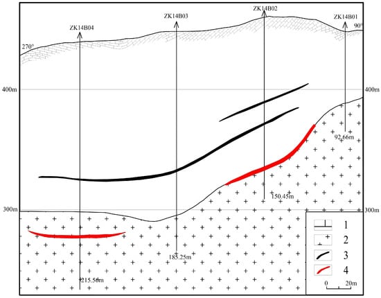 Drilling Results in the Longshang mining district (modified from [14]). 1: Devonian limestone; 2: medium-fine-grained porphyritic biotite granite; 3: skarn-type W-Sn orebody; 4: greisen-type W-Sn orebody.