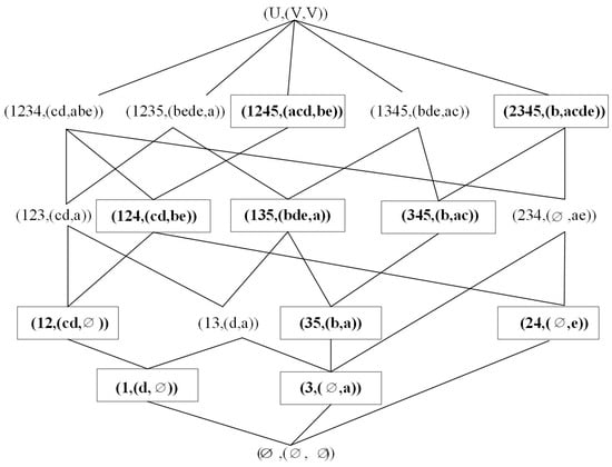 Furthermore, the three-way object-oriented concept lattice  can be built based on the partial relationship between the concepts (Equation (14)). The lattice is shown in Figure 1, in which the concepts marked with a box are basic OEO-concepts.