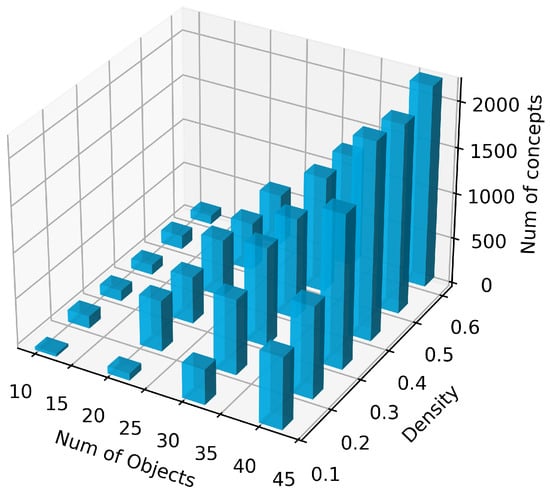 The data consisted of artificial datasets and real-world datasets. For a formal context , there are three factors, the number of objects , the number of attributes , and the dense of non-zero entries, which can influence the number of OEO-concepts . Thus, we used different arguments of these three factors to randomly generate a series of datasets. It is not necessary to separately illustrate them, and we represent the characteristics of each dataset by a naming rule whereby a randomly generated data table with m objects, n attributes, and average non-zero entries of  is called Data_OmAnDd. , , and , , , , , . Furthermore, any group of datasets can be simply expressed. For instance, the datasets Data_OmA5Dd, in which  and , can be simply denoted by Data_A5. The real-world datasets came from the UCI Machine Learning Repository (https://archive.ics.uci.edu/datasets/, accessed on 17 February 2025), including Balloons, Lenses, COVID-19 surveillance. All of the datasets were prepared as formal contexts without noisy and incomplete data in our experiments.