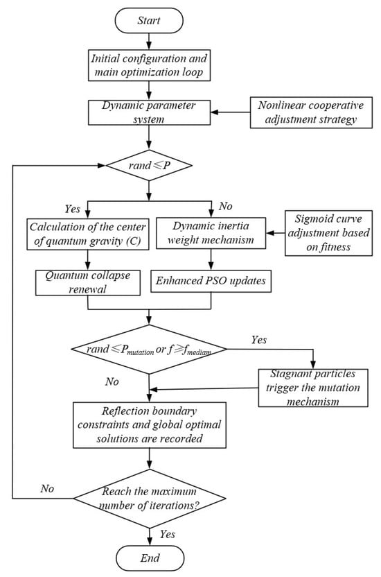 The quantum-behaved particle swarm optimization (QPSO) algorithm integrates PSO optimization mechanisms with quantum-inspired strategies. It uses parallel fitness evaluation to compute the objective function for all individuals in the population. Its core process is shown in Figure 1.