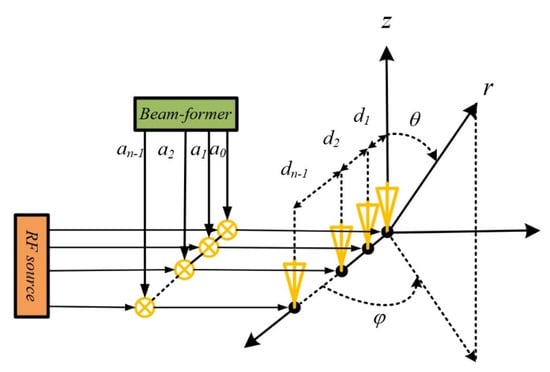 where the default excitation amplitude of each array element is assumed to be ;  is the spacing between adjacent antenna elements,  is the incident beam angle,  is the phase deviation of the nth antenna,  is the wavenumber, defined as  where  is the wavelength, and  is the observation angle. Figure 2 is a schematic diagram of a common linear array: