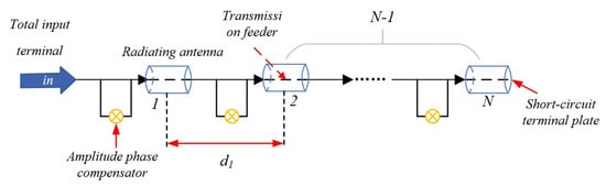 This paper presents an innovative antenna array design, employing a series-fed approach []. The spacing between every two antenna elements varies, eliminating the need for an overall symmetrical layout while achieving low sidelobe performance. The relevant schematic is shown in Figure 3.
