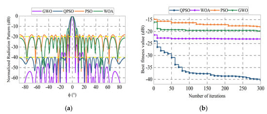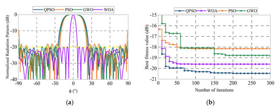 In Figure 6a, among the normalized array factor patterns of the four algorithms, the sidelobe levels of classical PSO and the GWO are relatively high, exceeding −20 dB, while those of the QPSO and WOA are below −20 dB.