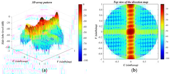 Figure 7a presents the 3D pattern of a sparse matrix. The radiation field is distributed across all four quadrants, with maximum radiation  at the origin. At a specific angle, the sidelobe radiation intensity where  is more significant than in other directions, when .