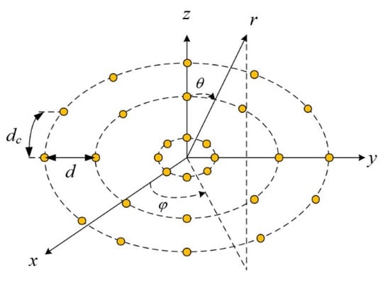 Here,  is the spacing between elements in the same ring, randomly distributed between 0.5 and 0.8 ;  represents the spacing between different rings; and  is the number of elements on each ring, which increases gradually with the increase in the ring spacing.