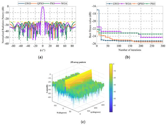During the sidelobe level iteration of the four algorithms, the maximum sidelobe levels of all algorithms are below −20 dB, but only the grey wolf optimizer and quantum-behaved particle swarm optimization algorithms achieve a value below −25 dB. As shown in Figure 9b, the proposed hybrid optimization algorithm shows superior search ability and stability compared to the grey wolf optimizer in the late iteration stage.