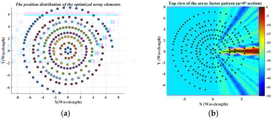 Figure 10a shows the element position layout of the array. The array, centered at the origin, has its elements distributed sparsely across 8 rings. The radiation pattern of the array is shown when  in Figure 10b.