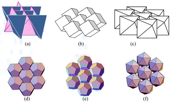 TI assemblies of (a) tetrahedra; (b) cubes; (c) octahedra; (d) dodecahedra, packing 1; (e) dodecahedra, packing 2; and (f) octahedra; the figures are drawn following [,,,,].