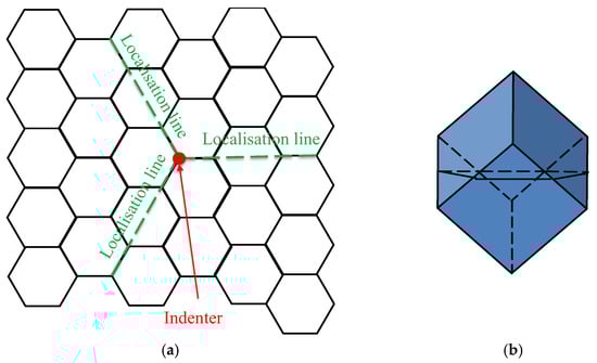 Illustration of localization lines developing in TI cubic assembly under indentation (observed in experiments and numerical modeling [,]): (a) central section of the TI assembly of cubes; and (b) generator cube with a hexagonal central section shown.