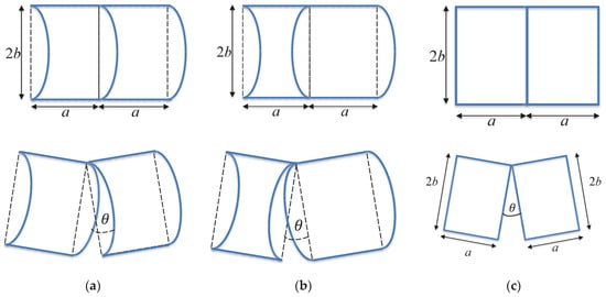In order to understand the effect of rotational degrees of freedom and elbowing, consider a 2D model of a cross-section of a TI plate in a co-ordinate frame (x, y); see the schematics in Figure 5. (This is essentially a toy model presented to investigate the main features of the mechanics of the deformation of interlocking structures. It extends the simplification proposed in [].) Assume each block to be infinitely rigid. Each block can have positive relative displacement, , and rotation, (the z-axis being directed from the reader), with zero vertical relative displacement, , ensured by interlocking. (This does not exclude macroscopic vertical deflection, that is allowed by finite stiffness of the peripheral constraint.) Given the in-plane (axial) compression applied by the peripheral constraint, the relative displacement, , can only be produced by relative block rotation (elbowing). The relative rotation results in corner interactions of the neighboring blocks. Figure 7 shows a fragment of a topological interlocking beam with equal symmetrical blocks, Figure 7a, or with alternating blocks, Figure 7b, of shapes of two types. (We only consider curved contact surfaces, the ones that make topological interlocking beams possible). It is evident that the relative displacement and rotation under deflection-produced loading are controlled by the action of corners as long as the rotation is sufficient to open the contacts. The corners of these blocks coincide with the corners of simple rectangular blocks (broken lines in Figure 7a,b). Therefore, it is sufficient to model the blocks in a cross-section of interlocking plates by rectangular blocks, with restricted relative vertical displacements representing the effect of topological interlocking; this is expressed by the condition . We also note that if is the force (e.g., the constraining force), the moments created by it with respect to the block centroid are the same in all three cases shown in Figure 7.