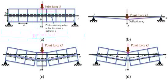 Fragmented beam model; the broken lines indicate the holes in the blocks for the post-tensioning cable (see Appendix A for the equivalence between the post-tensioning cable and an external constraint frame): (a) fragmented beam with n rectangular blocks of width a and height 2b as a model of a TI beam under point force Q; (b) point deflection of the post-tensioning cable; this configuration will be used as a representation of a macroscale continuum model of the bending of a fragmented beam; and (c,d) discrete (microscale) interpretations of the continuum model of the point deflection of a fragmented beam.