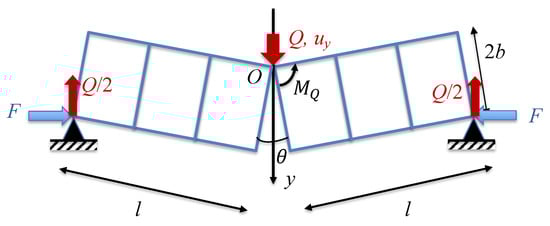 In line with the reasoning of the previous section, we consider a 2D model of the deflection of a TI beam as a beam consisting of n rectangular blocks of length a; its thickness is 2b. The beam length is , Figure 8a. The beam is loaded by point force Q. The role of the peripheral constraint is played by an internal post-tensioning cable of stiffness k loaded by initial force (post-tensioning here refers to applying tension to the cables after the blocks are assembled).