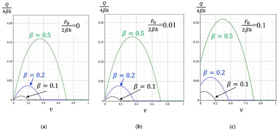 Figure 11 shows the normalized force–deflection curves for different values of the normalized initial force, , and beam half-thickness, . They start with , which corresponds to negligible pre-tension.