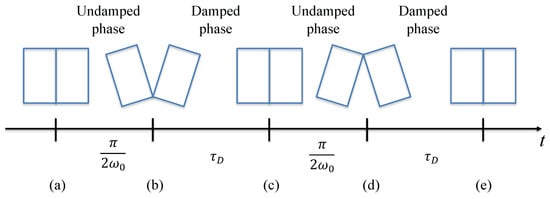 Discontinuous damping is understood here as damping only working during a part of the oscillation period. Figure 12 illustrates the timeline of emerging discontinuities of damping produced by energy absorption due to air squeezing between the contacting surfaces of the neighboring blocks. It is seen that the oscillating cycle consists of two undamped–damped phases (Figure 12b–e). Therefore, the sequence of undamped–damped phases is antisymmetric, leading to equality in durations of the undamped and damped phases.