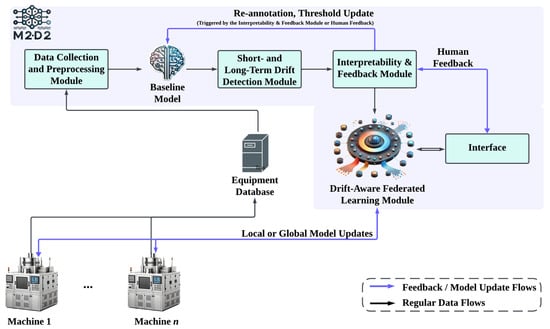 These gaps highlight the need for an integrated framework capable of unifying multi-modal data preprocessing, robust baseline modeling, interpretable short-term and long-term drift detection, active learning for continuous adaptation, and drift-aware federated coordination. To meet this challenge, we propose the M2D2 framework. M2D2 combines several design objectives that collectively address the shortfalls of existing methods: (1) a systematic approach to combining numeric, textual, and categorical inputs, ensuring that crucial signals are not overlooked; (2) a dual-level drift detection pipeline that flags both acute anomalies in real time and gradual shifts over extended windows; (3) interpretable modules that pinpoint root causes of drift, enhancing trust and transparency for engineers and decision-makers; (4) an active learning loop that refines detection thresholds and model parameters based on timely human or automated feedback; and (5) a drift-aware federated learning strategy that synthesizes local models without being jeopardized by severe parameter mismatches in individual machines.