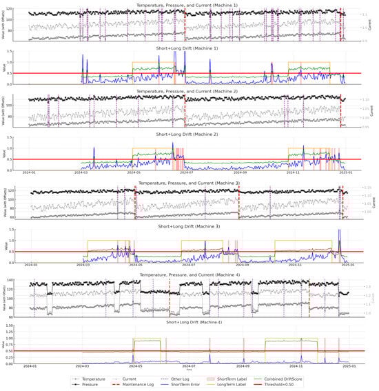 In the preprocessing phase, sensor data (temperature, pressure, current) were integrated with maintenance logs (e.g., maintenance) and categorical attributes (e.g., Recipe A, B; Product Type X, Y, Z) to form a unified multi-modal feature vector at each time point. Missing sensor values and timestamp misalignments were corrected via linear interpolation and autoencoder-based inpainting, followed by Z-score normalization to harmonize feature scales. After this procedure, every time step became a coherent snapshot of numeric readings, text-based log embeddings, and relevant recipe or product labels. In the top section of Figure 2, Machines 1, 2, and 3 display well-synchronized pressure, temperature, and current signals. Machine 3, due to its heavier load and more frequent maintenance schedules, contributed a richer set of textual log entries, consistently appearing as significant factors in subsequent modeling phases. Machine 4’s mixed-recipe data were similarly integrated, revealing periodic parameter shifts whenever it switched between Recipe A and Recipe C. These shifts further tested M2D2’s preprocessing robustness, especially in terms of handling abrupt transitions in product types X and K.