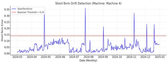 Once deployed in real time, the system scrutinizes each arriving multi-modal instance for abrupt deviations. A surge in reconstruction error prompts a Bayesian threshold mechanism to decide whether a short-term label is warranted (as shown in Figure 3), thereby adapting the decision boundary to fluctuating production contexts. The bottom portion of Figure 2 features purple dashed lines that denote short-term alerts. Machine 1 exemplifies this phenomenon, generating multiple warnings in the spring of 2024 tied to intermittent current spikes. Machine 3, owing to its high-throughput recipes, occasionally underwent sudden current surges, aptly captured by concurrent log references such as “current fluctuations.” For Machine 4, spikes often occurred during transitions between Recipe A and Recipe C, creating short-term anomalies whenever process parameters briefly deviated from baseline norms. These minute-scale alerts empower operators to intervene preemptively, preventing minor anomalies from amplifying into more serious downtime.