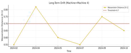 While immediate alerts address abrupt perturbations, the system also assesses whether machines undergo incremental shifts over extended periods. To accomplish this, data from several days or weeks are aggregated and then compared to the baseline distribution using KL divergence or Wasserstein distance. Furthermore, as shown in Figure 4, every 30 days the system checks for sustained drift, and if it exceeds the designated threshold, the long-term label is set to 1. If this measured gap remains elevated beyond a certain threshold, the model designates a long-term drift. Figure 2 uses intervals shaded orange (long-term label) and red (short-term label) to indicate drift events, such as those observed in Machine 2 from late spring to early summer 2024. At times, maintenance logs made a note stating “maintenance schedule postponed”, implying that slight, cumulative deviations can escalate without proper calibration or part replacements. By distinguishing chronic drift from short-lived anomalies, the system facilitates well-timed preventative actions.