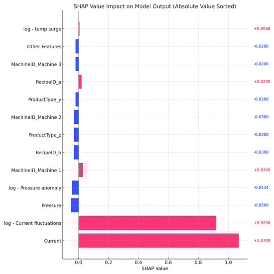 Anomaly detection alone offers limited practical benefit unless operators can pinpoint the primary causes. Phase 4 implements interpretability techniques—particularly SHAP—to map detected anomalies back to the most impactful features, encompassing both numeric sensor values and textual maintenance logs. In one instance, during the short-term alert on 17 June 2024, SHAP revealed that a sharp rise in “current” alongside repeated mentions of “current fluctuations” in the logs were the main contributors, as shown in Figure 5. This consistent alignment between numeric sensor data and textual entries steered engineers to inspect the electrical supply infrastructure and measurement modules, reducing speculation and the time to resolution. Moreover, if “current fluctuations” repeatedly emerges as a top driver in future alerts, process parameters tied to current regulation can be reevaluated to forestall additional incidents.