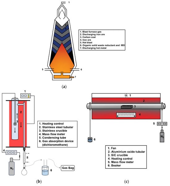 The expected blast furnace feed location for the reduction of IBD using organic solid waste is shown in Figure 2a. The high-temperature reduction experiments were conducted in a homemade vertical furnace, as shown in Figure 2b, and a microwave furnace, as shown in Figure 2c. During the experiments in the vertical furnace, the temperature was climbed up to the set temperature (700 °C, 800 °C, 900 °C, 1000 °C, 1100 °C), with the material temperature monitored by a thermocouple (temperature deviation less than 3 °C) under mixed N2 and O2 flow (50 mL/min), and the O2 proportion was adjusted (0%, 2%, 4%, 6%, 8%). A total of 6 g of material was used, comprising a mixture of IBD and reductant in different ratios (1:1, 2:1, 4:1, 9:1, 14:1), and placed in a crucible suspended in the furnace (or preloaded in the furnace and heated at 10 °C/min to the target temperature) for different holding times (15 min, 30 min, 45 min, 60 min, 90 min). The reacted gas was discharged from the bottom of the furnace, condensed with −10 °C anhydrous ethanol, and collected in a gas bag. After the reaction, the system cooled naturally under nitrogen protection. The heating rate under this rapid heating scenario reached 111.5 to 687.1 °C/min. The optimal group was conducted in the microwave furnace as comparation, with the same conditions but placed in a SiC crucible and heated by microwave. The temperature was increased at a rate of 10 °C/min to the target value with less than 1 °C deviation.
