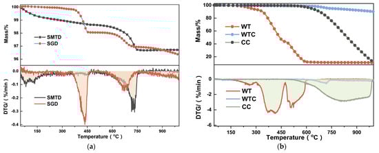 Through TG-DTG experiments, both types of IBD are relatively stable at high temperatures, showing two-stage weight loss, with only 3–4% total weight loss at 1100 °C. As shown in Figure 3a, for SMTD, the main phase is α-Fe2O3, which can stably exist below 1200 °C [25]. Stage I (50–196.2 °C), with a weight loss of 0.83%, occurs primarily due to the volatilization of SO3 and free water. The S in SMTD can be incorporated into liquid-phase or solid-phase particles, forming stable substances, partly in the form of SO3 [26], and the MgFe2O4 it contains can adsorb some moisture from the environment, with both substances volatilizing at low temperatures. Stage II (569.5–750.5 °C), peaking at 733.5 °C, with a weight loss of 1.81%, is consistent with the decomposition of CaCO3 [27,28]. The peak may not appear in the spectrum due to its content being below the XRD detection limit [29]. For SGD, Stage I (357.9–461.7 °C), with a weight loss of 1.78%, corresponds to the decomposition of a small amount of Ca(OH)2 formed by the absorption of water by CaO [21]. Stage II (571.4–722.1 °C) is essentially consistent with SMTD, with the peak weight loss rate temperature at 672.7 °C and a weight loss of 1.02%. As for the reductant in Figure 3b, WT starts to lose weight at the lowest temperature, beginning at 170.46 °C. This process can be divided into two types: the volatilization of oil content and the subsequent decomposition of the elastomer [30]. This weight loss occurs in three stages: Stage I (170.46–298.60 °C), peaking at 265.39 °C with a total weight loss of 6.58%, corresponds to the volatilization of moisture and light volatile substances [31]. Stage II (298.60–474.92 °C), peaking at 415.94 °C with a cumulative weight loss of 56.72%, corresponds to the decomposition of natural rubber and partial synthetic rubber (SBR cracking and dehydrogenation to form styrene and butadiene monomers) [32,33]. Stage III (474.92–603.49 °C), characterized by two smaller peaks, resulting in a cumulative weight loss of 88.11%, corresponds to the decomposition of synthetic rubbers such as styrene–butadiene rubber and butyl rubber [32]. Due to the incorporation of additives (such as Zn, Fe, Si, S, etc.) during the tire manufacturing process, a residual ash content of approximately 10% is typically observed [34]. Since the yield of carbon and gases from waste tires remains relatively constant at temperatures above 500 °C, and the carbon conversion rate peaks at 600 °C [35], WTC is produced by calcining WT at 600 °C for 30 min. During the formation process of WTC, some pyrolytic tar adheres to the surface, leading to secondary reactions such as tar conversion to carbon during thermal degradation [36,37]. As a result, a 10.0% weight loss is observed between 600 and 1000 °C. The C/H ratio for CC is 79.04, significantly higher than WTC’s 41.90, indicating a greater degree of unsaturation and more complete reactions with a cumulative weight loss of 86.47% [38].