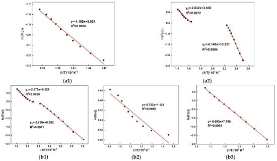 The pyrolysis kinetic analysis was based on the OFW mode [22,23,24]. The reaction order was n = 1. The activation energy Ea and pre-exponential factor A were calculated from the slope and intercept of the fitted line obtained by plotting lnβ against 1000/T.