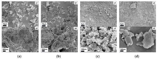 SEM image of raw materials: (a) SMTD: (a1) ×1k, (a2) ×16k; (b) SGD: (b1) ×1k, (b2) ×16k; (c) WTC: (c1) ×5k, (c2) ×100k; (d) CC: (d1) ×5k, (d2) ×100k.