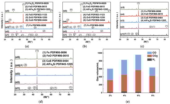 Reduction of samples under different conditions: (a) XRD spectrum of different temperature: (a1) 700 °C, (a2) 800 °C, (a3) 900 °C, (a4) 1000 °C, (a5) 1100 °C; (b) XRD spectrum of different carbon ratio: (b1) 1:1, (b2) 2:1, (b3) 4:1, (b4) 9:1, (b5) 14:1; (c) XRD spectrum of different oxygen ratio: (c1) 0%, (c2) 2%, (c3) 4%, (c4) 6%, (c5) 8%; (d) XRD spectrum of different reaction time: (d1) 15 min, (d2) 30 min, (d3) 45 min, (d4) 60 min, (d5) 90 min; (e) GC results of different oxygen ratio.