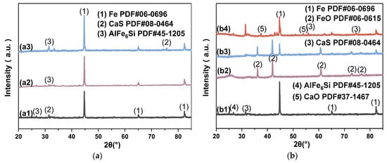 The XRD spectrum of the reduction residues obtained under different heating methods shown in Figure 8a indicate that there is little difference in the reduction effects of the heating methods. The degree of reduction in all groups is high, with no iron–oxygen phases detected. The rapid reaction at high temperatures (1000 °C) diminishes the influence of the heating method on the reduction process [51]. From Figure 8b, the raw materials affect the phase composition of the residue. The reduction effects of different reductants vary, with the reduction effect having the following order: WTC > WT > CC. The WTC-reduced residue contains no iron–oxygen phases, which is due to the small weight loss during the pyrolysis of WTC, allowing the remaining carbon to fully participate in the redox reaction with Fe. WT and CC exhibit a weight loss of over 85% during pyrolysis, resulting in incomplete reduction reactions, and the residues contain relatively high amounts of FeO. When IBD is replaced by SDG, the lower Si and Al contents in the SDG lead to the substitution of AlFe6Si in the reduced residue by CaS and CaO. Additionally, several other minor peaks are observed, but the iron phase is fully reduced to MFe, further supporting the reduction effectiveness of WTC.