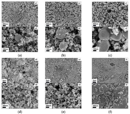 SEM image of reduced residues in different conditions: (a–c) heating methods: (a) PH: (a1) ×16k, (a2) ×100k; (b) FH: (b1) ×16k, (b2) ×100k; (c) MH: (c1) ×16k, (c2) ×100k; (d–f) different materials: (d) CC-A: (d1) ×5k, (d2) ×50k; (e) SGD-A: (e1) ×5k, (e2) ×50k; (f) WT-A: (f1) ×5k, (f2) ×50k.