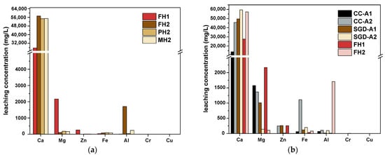 The TCLP results are shown in Figure 10, where labels 1 and 2 represent the raw materials and the residues after the reaction, respectively. The effect of different heating methods and raw materials on the leaching levels of various metals varies. The heating method has little effect on the leaching levels of six metals except for Al. After the reduction reaction, the leaching amount of Ca significantly increases, while those of Mg and Zn significantly decrease. The IBD raw materials contain a certain amount of CaCO3, which exhibits lower leachability under acidic conditions compared to CaO [56]. During the high-temperature carbothermal reduction process, CaCO3 partially decomposes into more leachable CaO, leading to an overall increase in Ca leaching from the residue. Notably, the SGD-A1 group, with a higher f-CaO content, showed greater Ca leaching than other materials. Mg and Zn can volatilize in metal form during the carbothermic reduction process [57,58]. A higher reduction degree promotes more complete conversion to their elemental forms, resulting in lower leaching concentrations. Given its higher activity, Mg shows a more pronounced difference in leaching before and after the reaction. For Al, it forms AlFe₆Si with Fe and Si. Since Fe-Al-Si is a negative deviation system with Fe having the largest negative deviation, it can increase the activity of Al [59]. When the reduction reaction is relatively complete and the Mfe content is high, the activity of Al in the multicomponent system approaches that of metallic Al. However, since the temperature is below 1600 °C, most of the aluminum phases remain inert, mainly existing in an amorphous form, which has higher solubility than crystalline phases [60,61]. Consequently, the higher Mfe content in the residue corresponds to increased Al leachability. Figure 10a shows the Al leaching differences before and after reduction and indicates the order of reduction degree as FH > MH > PH. In Figure 10b, the FH2 group, which has the highest Mfe content, exhibits the highest leaching of Al, further confirming this point.