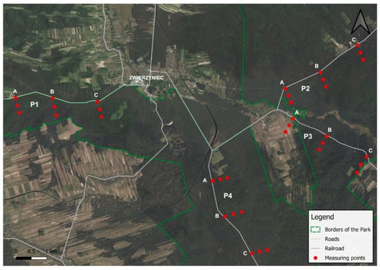 The highest sound levels were observed at points directly along the road routes, ranging from 57.9 to 71.2 dB, attributed to traffic noise. The recorded sound levels, including those from points 250 m away from the traffic routes, often exceeded 40 dB (35.4–48.6 dB), encompassing both natural and anthropogenic sounds, demonstrating the acoustic impact of the road routes at this distance. At points 500 m from the roads, sound levels primarily ranged from 33.0 to 42.0 dB, with exceptionally high levels measuring between 43.5 and 47.2 dB. Natural sounds dominated at this distance. Although there are no specific regulations on noise threshold values for environmentally protected areas, it can be concluded that the recorded traffic noise levels were high across all study areas. The most significant noise impact was noted in the immediate vicinity and at a distance of 250 m from the traffic routes. The measurement results indicate a clear relationship between the distance from the noise source and sound level; the sound levels at the points closest to the road were the highest, decreasing as the distance increased. However, in test area P1 for measurement profiles B and C and in test area P4 for measurement profile B, higher sound levels were recorded at a distance of 500 m. In all analyzed research areas, the differences in noise levels between points located from 0 m to 250 m from the road ranged from 13.8 dB to 35.6 dB, with further distances from the traffic route showing no similarly significant changes. Similar findings were reported in [