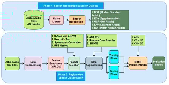 The MFCC feature extraction method is applied for feature extraction, and separated transcriptions are further examined using techniques such as Kendall’s Tau, Spearman’s correlation, and K-Best with ANOVA to choose the superlative features. In phase 2, the focus is on region-wise dialect classification, where feature selection and data augmentation are conducted using techniques such as SMOTE, random oversampling, and ADASYN. CNNs with different architectures (1D and 2D CNNs) and ANNs are deep learning models trained using augmented data. Parameters such as accuracy, precision, recall, and F1-score are simulated to gauge the trained models, and their performances are assessed against raw sample audio data. To correctly identify and categorize Arabic dialects from diverse geographical locations, this study elaborates on an architecture combining linguistic analysis and deep learning techniques, ultimately advancing NLP for the Arabic language. One-dimensional and two-dimensional convolutional neural networks (CNNs) are employed in dialect classification due to their compatibility with the input data format and their proficiency. A 1D CNN is optimal for sequential input, such as raw audio waveforms or text sequences, by employing filters along a single dimension to extract local temporal or sequential patterns, such as distinct phonemes, intonations, or word sequences that are indicative of various languages. A 2D CNN is specifically developed for two-dimensional data, such as spectrograms, which visually depict audio signals and illustrate the variation in frequency content over time. Using filters along both temporal and spectral dimensions, 2D CNNs can acquire intricate time-frequency patterns and prosodic characteristics that differentiate dialects. Both varieties of CNNs autonomously acquire hierarchical features from the data, diminishing the necessity for manual feature engineering. Performance evaluation criteria, including accuracy, precision, recall, F1-score, and the Matthews correlation coefficient, were employed in our study to analyze the performance of various models. Figure 2 represents the research flow diagram.