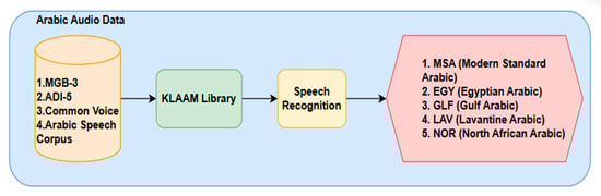 Dialects are variances in phonology, lexicon, and grammar shaped by cultural influences, educational backgrounds, geographical locations, and socioeconomic levels. Automatic Dialect Identification (ADI) systems seek to identify dialects from spoken utterances by analyzing speech features [1]. More than 420 million people speak Arabic, a Semitic language with an intense cultural heritage and history, particularly in the Arab world and numerous diaspora communities. The linguistic landscape of the Arab world differs significantly, even though Modern Standard Arabic (MSA) is the certified lingua franca of Arab nations and operates as a communication platform in media sources. The Arabic dialects used in colloquial speech diverge considerably compared with MSA based on phonology, morphology, and syntax. Simultaneously, MSA is the solitary structured and standardized variant of Arabic used formally in written communications [2]. A broad range of Arabic dialects has been established over the centuries, each reflecting the area’s distinct history, topography, and cultural influences. These dialects’ pronunciation, vocabulary, grammar, and syntax are greatly diverse; whilst they are generally intelligible, they may pose serious obstacles to cross-regional communication and comprehension. For example, a person who speaks Egyptian Arabic faces a challenge in understanding Gulf Arabic or Levantine Arabic. Dialect identification (DID) is a process that inevitably determines the appropriate dialect within spoken or transcribed Arabic language. Listeners analyze incoming acoustic–phonetic information, including a speaker’s dialect or accent, which may vary from their native dialect across several dimensions of sound structure. The production patterns of non-native speakers frequently vary at all levels of phonological structure, and these discrepancies are prevalent among non-native speakers, irrespective of their native language backgrounds. Comprehending the impact of various linguistic variants on intelligibility, processing, and representation is essential. Listeners exhibit heightened sensitivity to the existence of non-native accents [3].