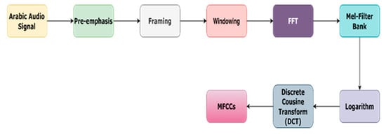 The first and second MFCCs can be used to compute the changes in speech from frame to frame. The Arabic audio dataset is used to generate 13 MFCC features. The block diagram for MFCC feature extraction is shown in Figure 4.