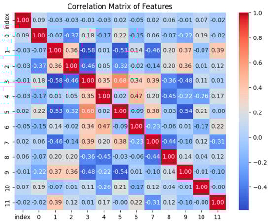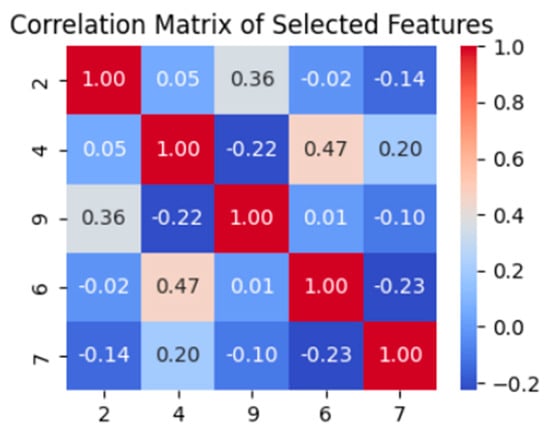 Based on a correlation matrix of the selected features, features 2, 4, 6, 7, and 9 were a good pick in terms of redundancy. Most of the chosen features showed very low to moderate absolute correlations, ranging from −0.22 to 0.23. The greatest value, 0.54, was observed between features 6 and 7, as shown in Figure 5 and Figure 6.
