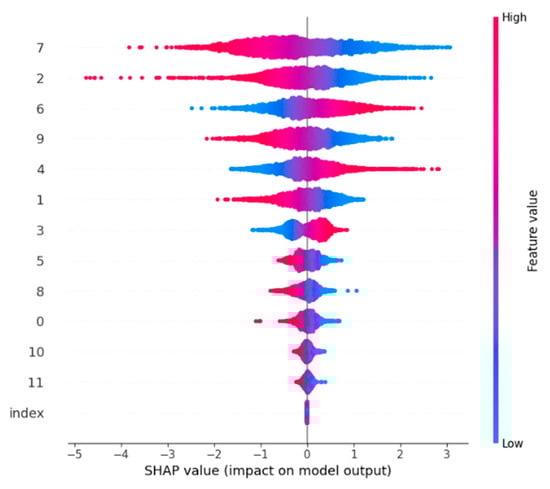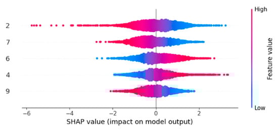 SHAP charts (Figure 7 and Figure 8) indicate that our model has strong interpretability. Since the selected features (2, 4, 6, 7, and 9) have a substantially greater magnitude and spread across the unselected features, the charts visually verify that these features are, in fact, the most important in the model’s decision-making process. Thus, our feature selection process is supported by this visualization, which also clarifies the “black box” nature of deep learning models.