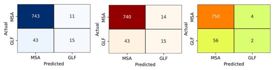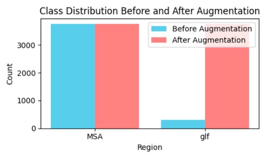 - Random oversampling: This technique matches the number of samples in the majority class (MSA) by randomly duplicating samples from the minority class (GLF). The method resulted in a total of 3762 GLF samples.