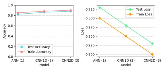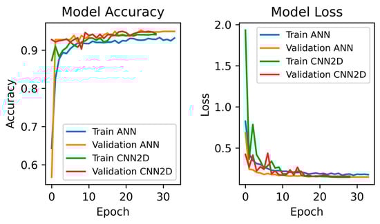 The assessment results for numerous machine learning models trained on datasets with and without the application of different data augmentation techniques are shown in Table 4. A 1D convolutional neural network (1D CNN), a 2D convolutional neural network (2D CNN), and an Artificial Neural Network (ANN) are among the models tested, while ADASYN, random oversampling, and SMOTE are the data augmentation techniques investigated. For every model–augmentation combination, the table presents important performance metrics, such as test accuracy, test loss, validation accuracy, and validation loss. The findings show that, in general, random oversampling enhances the performance of the 2D CNN and ANN models compared with the performance of the no-augmentation model. The 2D CNN model initially exhibited subpar performance, suggesting a significant class imbalance or a complex baseline classification issue; however, ADASYN markedly enhanced the MCC, especially for the 2D CNN.