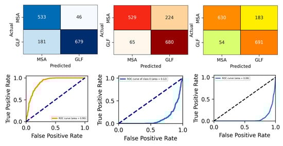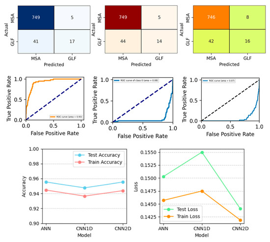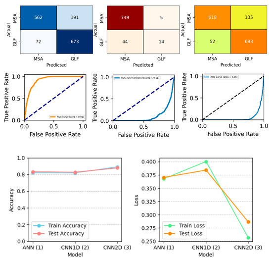 Figure 13, Figure 14, Figure 15 and Figure 16 show the confusion matrix, ROC_AUC curve, and Accuracy_Loss plot with no augmentation, ADAYSN, Random_Oversampler, and SMOTE, and for a binary class. ANN, 1D CNN, and 2D CNN are the three neural network models that are compared using confusion matrices. The models’ performances in terms of identifying two categories, MSA and GLF, are visualized. The counts of false positives, false negatives, and true positives for each model are shown in the matrices. With the most accurate classifications (true positives) and the fewest misclassifications (false positives and false negatives) for both MSA and GLF, the 2D CNN model seems to be the most visually accurate. Although all models show relatively high performances, the 2D CNN surpasses the ANN and 1D CNN in terms of recognizing the occurrences of both categories, indicating that it is the most effective architecture for this specific classification task.