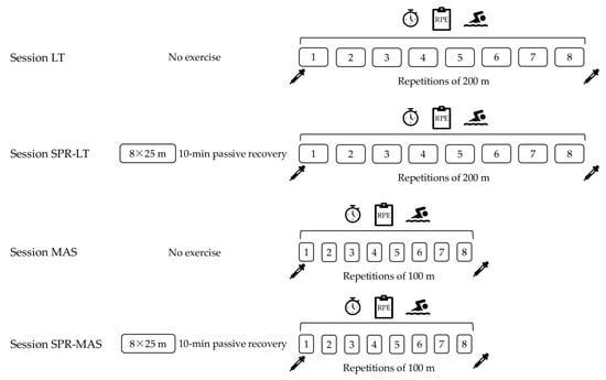 In a crossover design, four training sessions performed in a randomized order, incorporating the aforementioned training sets: (i) set LT (session LT), (ii) set SPR, followed by set LT (session SPR-LT), (iii) set MAS (session MAS), and (iv) set SPR, followed by set MAS (session SPR-MAS). A 10 min passive recovery period was implemented between sets in sessions SPR-LT and SPR-MAS, allowing adequate but not complete recovery to ensure ecological validity of real training conditions. The design of the study is illustrated in Figure 1.