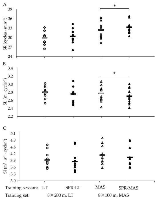Stroke rate (SR, panel A), stroke length (SL, panel B), and stroke index (SI, panel C) during 8 × 200 m performed at the lactate threshold (LT) and 8 × 100 m performed at maximal aerobic speed (MAS) in the training sessions conducted in the study. *: p < 0.05 compared to control session.