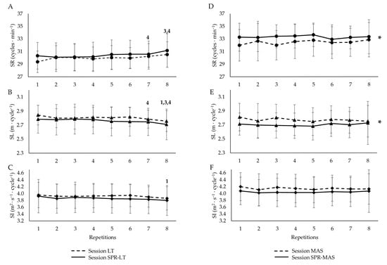 Stroke rate (SR, panels A,D), stroke length (SL, panels B,E), and stroke index (SI, panels C,F) across repetitions of 8 × 200 m (panels A–C) and 8 × 100 m (panels D–F) performed at the lactate threshold (LT) and the maximal aerobic speed (MAS), respectively. Numbers above repetition measurements indicate a significant main effect on repetition (p < 0.05) compared to the corresponding repetition. *: p < 0.05 between the sessions (main effect).