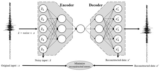 The Denoising Autoencoder (DAE) is a representative unsupervised learning-based neural network model that is widely used to remove noise from input data and extract core features of the original signal [12]. As a variant of the Autoencoder (AE), the DAE is trained by intentionally adding noise to the input data and learning to reconstruct the original signal. This process enables the model to learn robust feature representations [13].