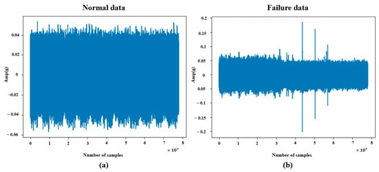 From the entire dataset, 7,800,000 data points were sampled for use in the experiment. The sampling rate of the data was 4000 Hz. Examples of the normal and fault data used in the study are shown in Figure 3.